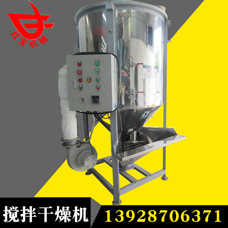 聚丙稀塑料顆粒大型熱風干燥機主要用于多種顏色塑料顆粒的混合、干燥。是注塑機.造粒機的必備配套設備之一,塑料粒子從進料 斗進入,在螺旋葉片推進力的作用下,沿著葉片表面向上滑動前進,在上部的離心力作用下,向桶體四周拋開,散開的物料不斷向下移動,由循環出料口和桶內循環料口不斷被螺旋葉片帶動提升,這樣反復循環,達到混合的目的。與此同時空氣經鼓風機送至電加熱箱中,加熱后成為熱風再經溫控表自動控制,以均勻合適的熱風從樹脂顆粒間一路穿透,穿過物料層,沿途進行熱交換,不斷帶走濕氣,樹脂粒子由上而下徐徐下降過程中連續不斷得到吹掃干燥,完成高效率干燥和混合工藝。